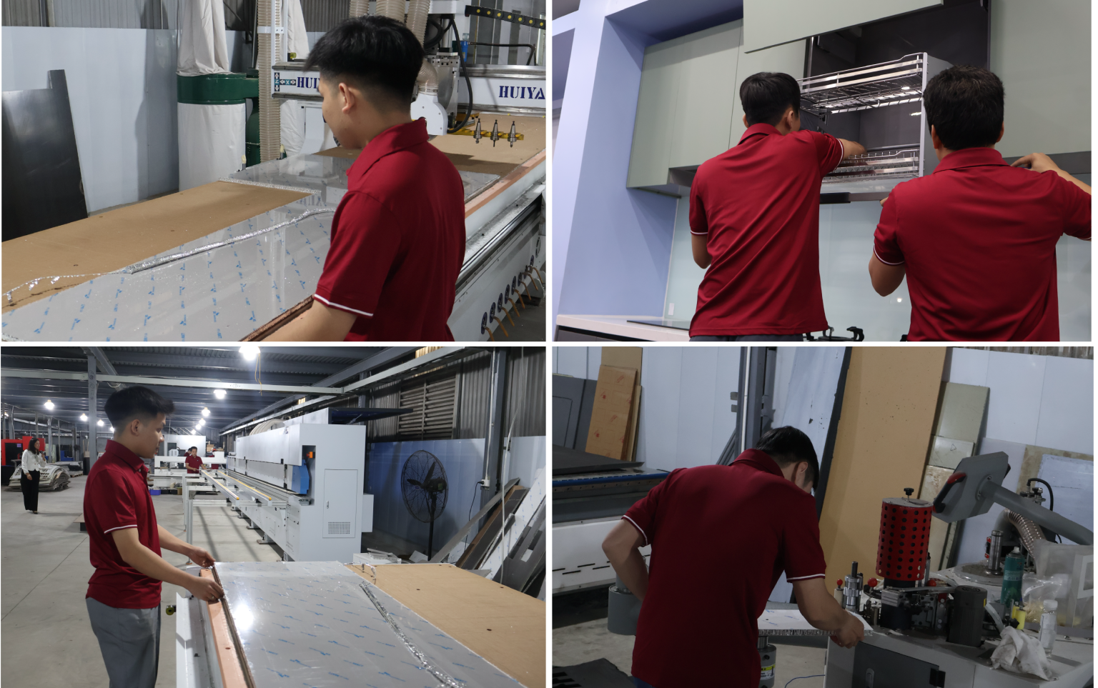 Mỗi tủ bếp Vkitchen được sản xuất tại nhà máy 3.000m², vận hành bằng máy móc hiện đại, quy trình kiểm soát chất lượng khắt khe – từ nguyên vật liệu đầu vào đến khâu lắp đặt cuối cùng.